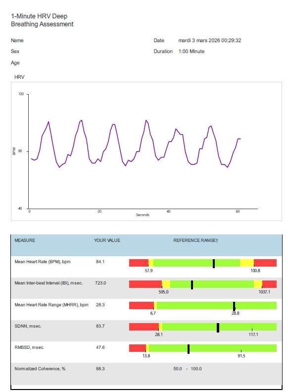 L’analyse de le VFC, quésako? La fréquence cardiaque n’est pas constante et varie dans le temps. La manière dont cette fréquence varie (la Variabilité de la Fréquence Cardiaque) peut être analysée. J’ai maintenant le Module EmwaveProPlus qui permet de donner différent calculs statistiques sur la VFC (SDNN, RMSSD, rapport LF/HF, …) avec 2 tests spécifiques et j’ai suivi la formation VFC-Expertise proposée par David O Hare pour utiliser au mieux ce module et comprendre ce que représente chaque donnée. Je